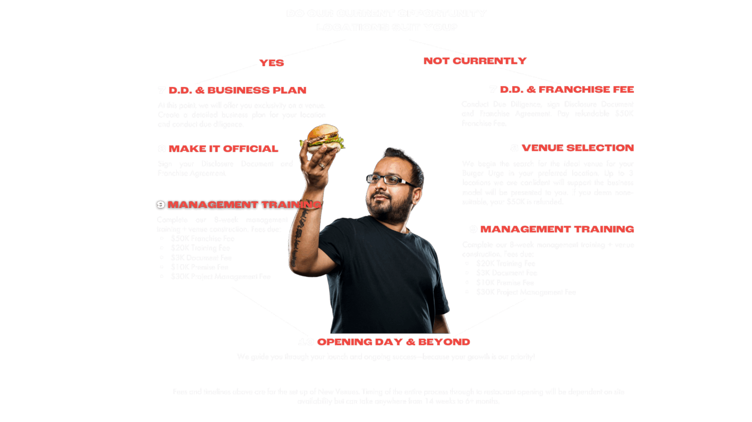 As a premium brand with a cult-like following and a proven, profitable business model, we set you up for success from day one. You get to OWN YOUR OWN BURGER BUSINESS while tapping into a powerful support network that’s with you every step of the way.